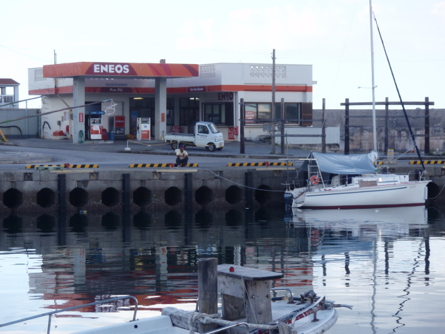 16日の朝に糸満を出航し南寄りの風の中、機帆走や機走を繰り返して翌日の17日午後3時半に伊良部島の佐良浜港に到着しました。今回は、宮古島の平良港にあるトウリバーは懲りたので、GSが近くにある佐良浜港にしました。写真のとおり至便でした。ところが着くや否や熱低発生、「足が速く明後日は大荒れになりそうだ」の情報。4時間後には糸満に向けて出航しました。台風が怖いので急ぎに急ぎ、風と好天にも恵まれ28時間後の18日午後11時半に糸満に帰着しました。
