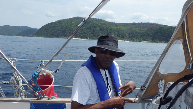 5月3日0600時、屋久島がアビームになり、北西の風がブランケットされたので、機帆走に切り替える。ところが5ノットの艇速にエンジンの回転を上げると、プロペラシャフトが異常に振動する。これは、プロペラに何か巻き付いたのに違いない。水深は200mあるが、クルーの榊原君が、潜って異物を取ることになった。海草が大量に巻き付いているとのことだ。何度も潜り、ようやく外れた。サメの姿を見張っていたが、全く見えなかったと、後で教える。