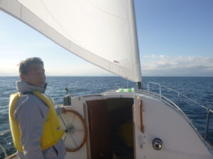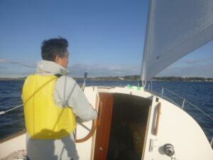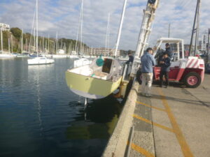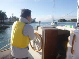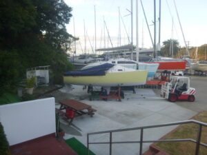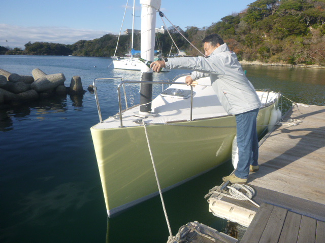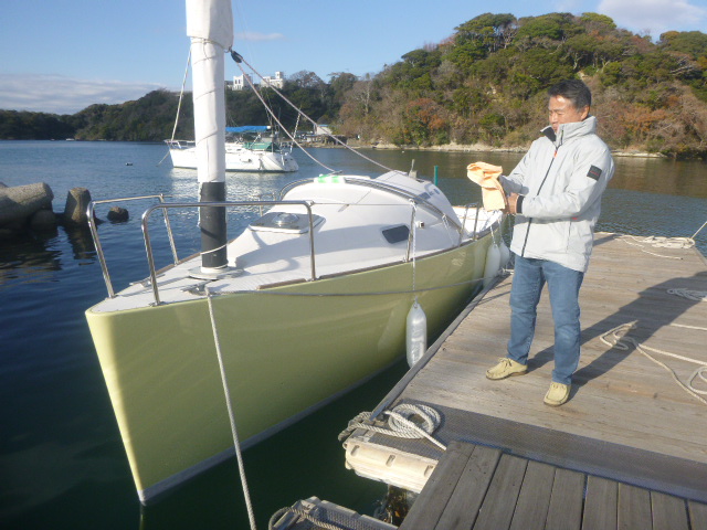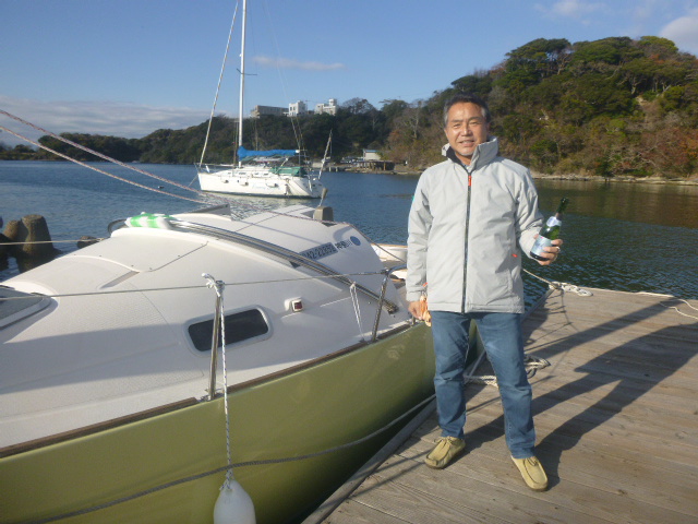 Okさんが家族のために選んだヨットは、LOUP DE MER(ルードメール)です。抱きかかえられるように海に降ろされて、颯爽と走り出しました。Okさんが拘ったハルカラーが周囲の緑に映えます。家族みんなで可愛がってくださいね~! (あ)