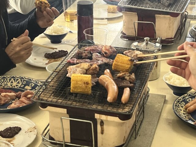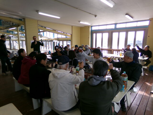 午後からは田尻漁港のBBQコーナーにて忘年会を行い、(株)ファイブ管理様ご協賛のビールで乾杯。