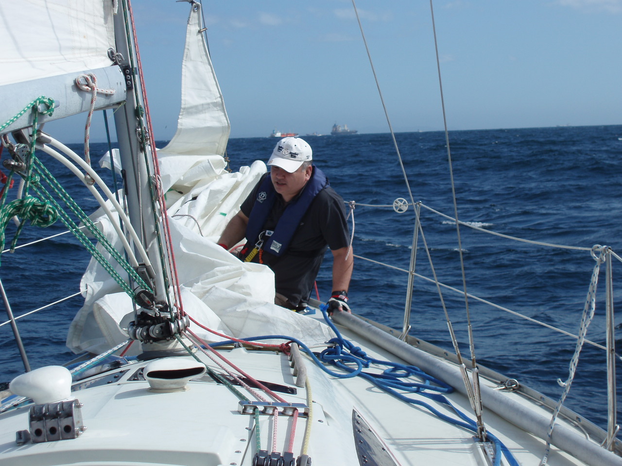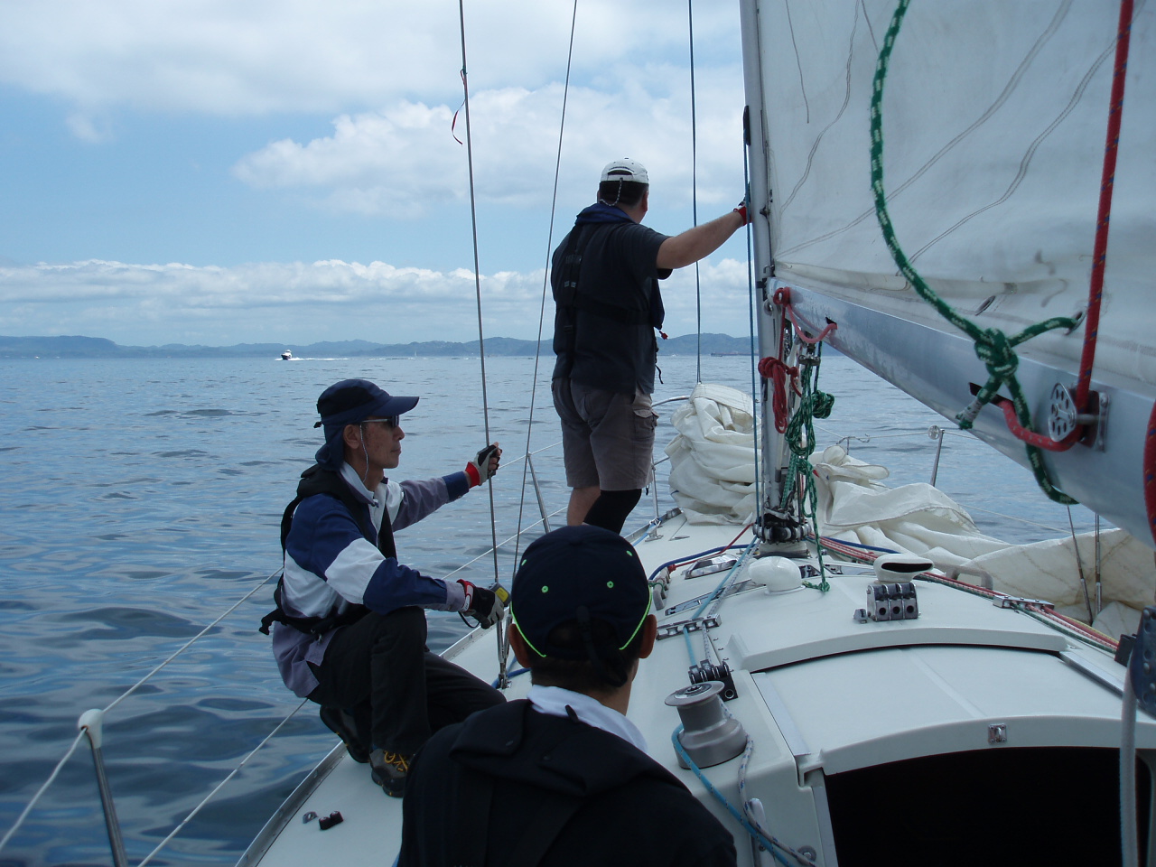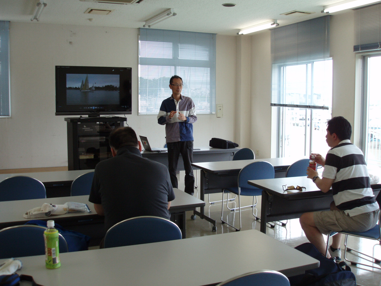 青木校長が突然、ほんとうに突然やって来ました! 関東レースチームは少々緊張気味です。 緊張したのはメンバーだけでなく、横須賀の海までもが緊張のあまり微風状態でした(笑)。 その証拠に、校長が下船した後はジブチェンジが要るくらいに風と波が立ってきたのです。 でも、いちばんの緊張はインストラクターである私(anzai)かな? (あ)