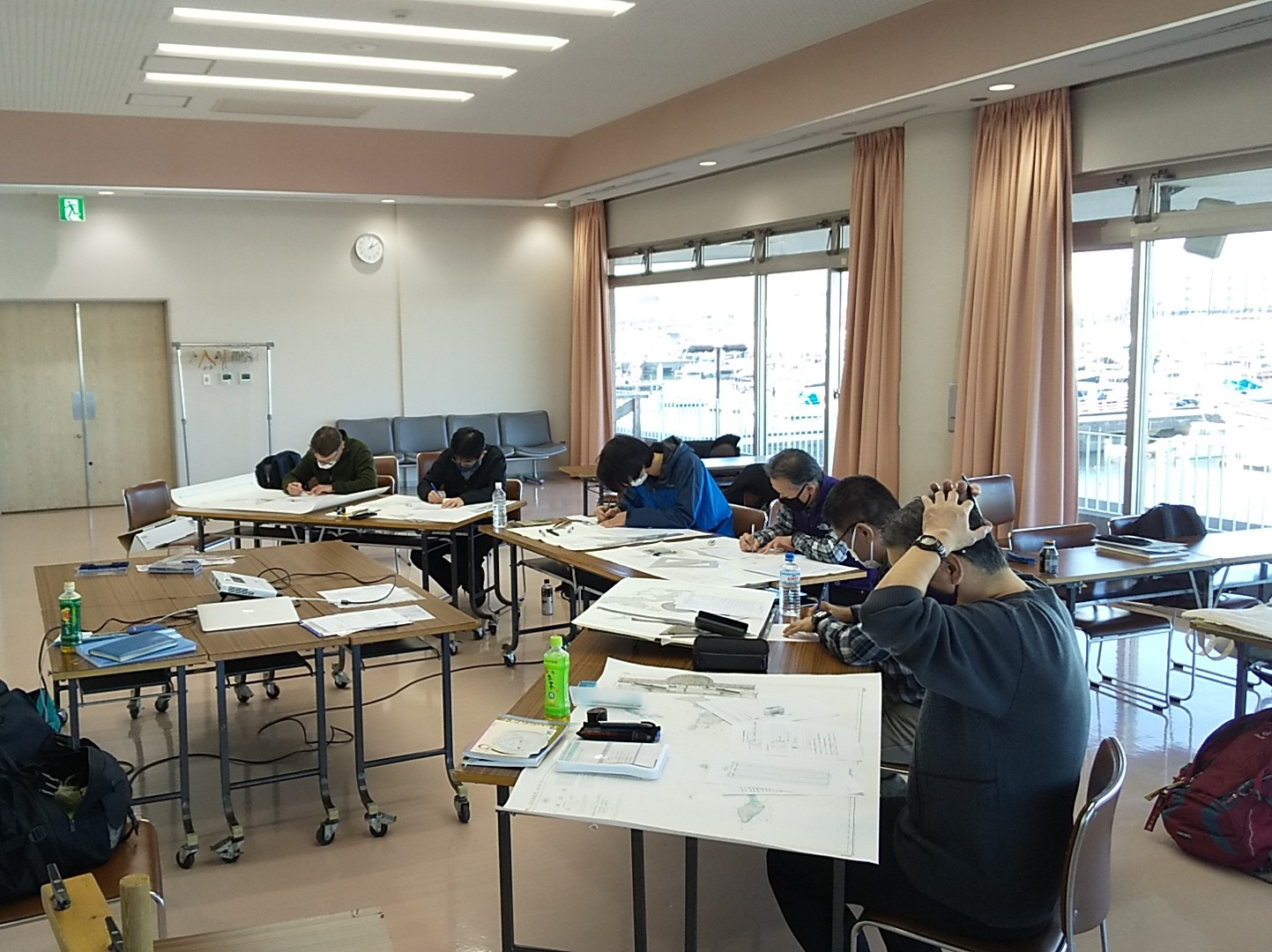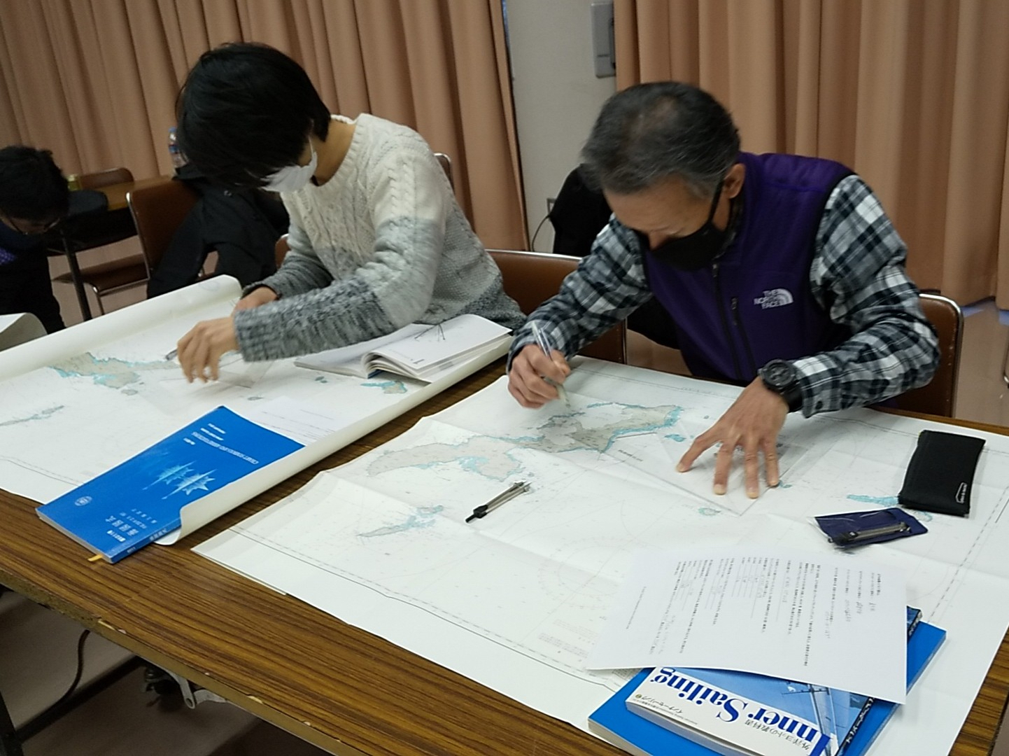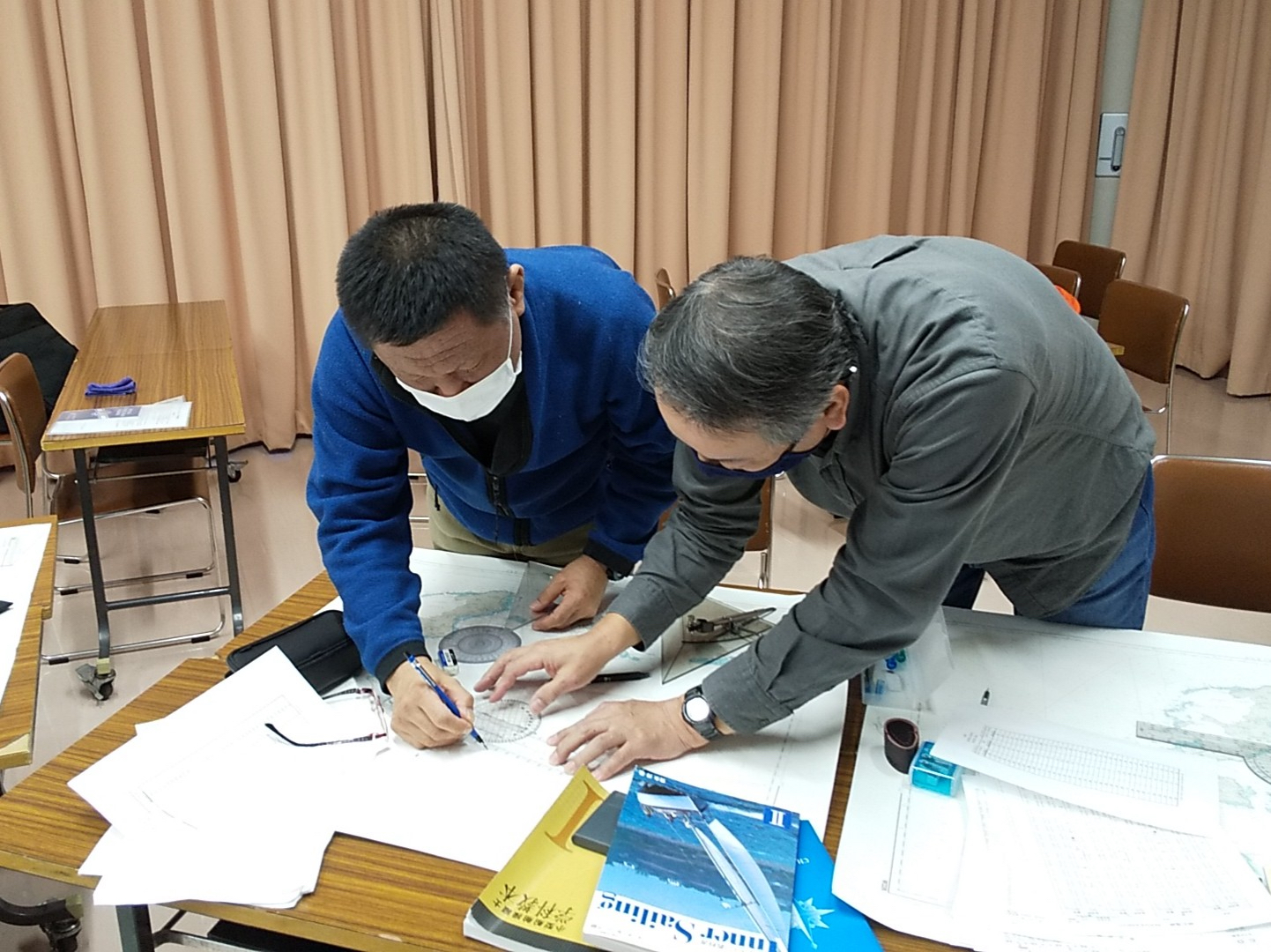 参加者の中にヘリコプターのパイロット出身の方がいました。激しく揺れるヘリの操縦席で、20cm 四方のニーボードの上でチャートワークをされていた経歴を伺い、すごい技術と脱帽しました。「ヨットのチャートテーブルは狭い!」と思っていましたが、、、ヘリのナビゲーションの環境に比べたら広いんですね。講習を担当して、とても良い勉強をさせていただきました。(Heday)