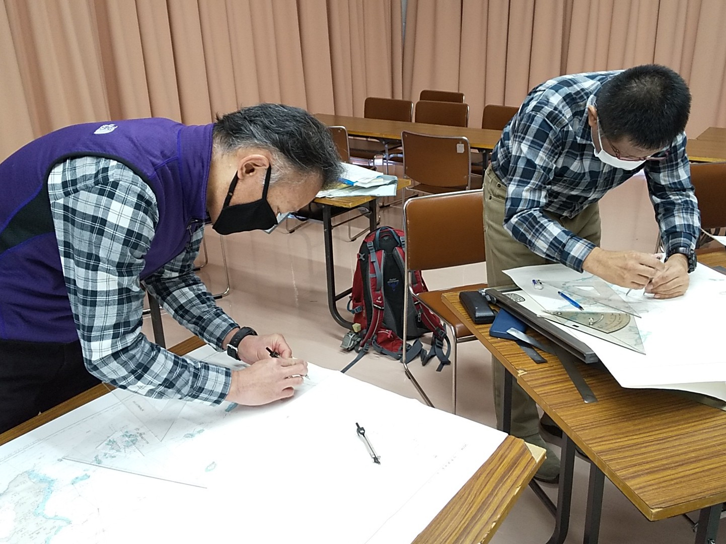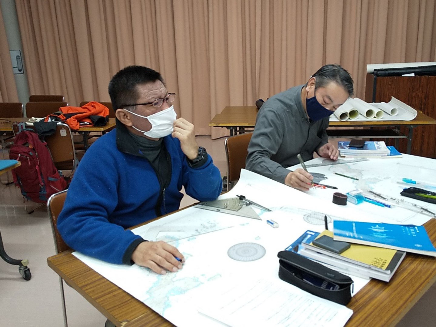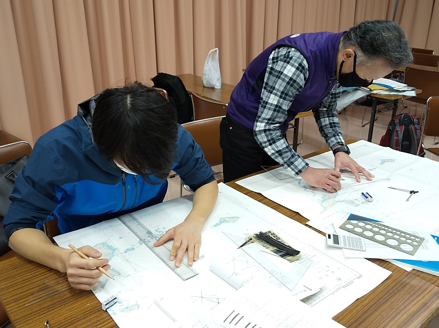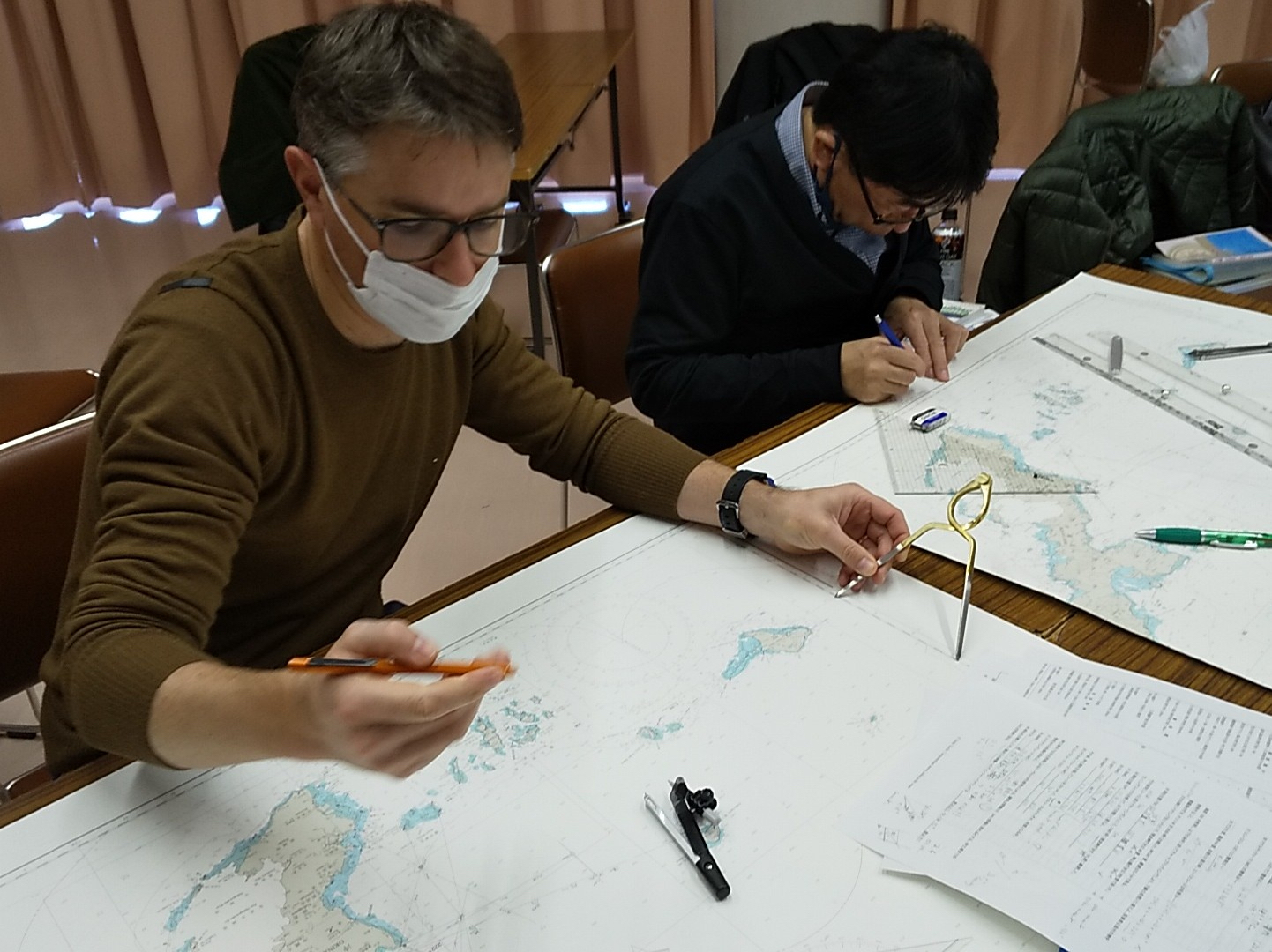 参加者の中にヘリコプターのパイロット出身の方がいました。激しく揺れるヘリの操縦席で、20cm 四方のニーボードの上でチャートワークをされていた経歴を伺い、すごい技術と脱帽しました。「ヨットのチャートテーブルは狭い!」と思っていましたが、、、ヘリのナビゲーションの環境に比べたら広いんですね。講習を担当して、とても良い勉強をさせていただきました。(Heday)