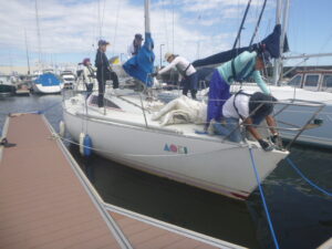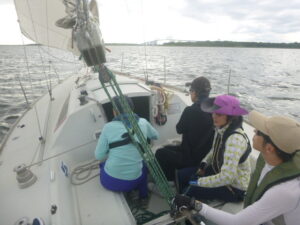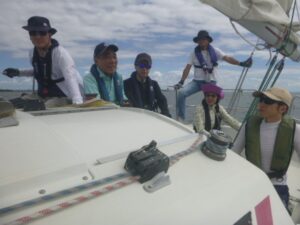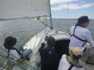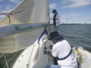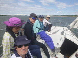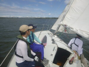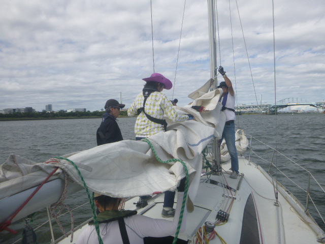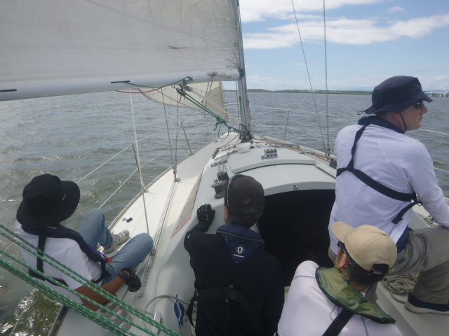 途中で風が強くなったので、メインセイルを1P縮帆しました。そうなんです、前月に桟橋で練習したリーフィングを実践しました。練習していたからこそ、初めてのデッキ作業を実行できたのです。練習は大事なのです。 (あ)