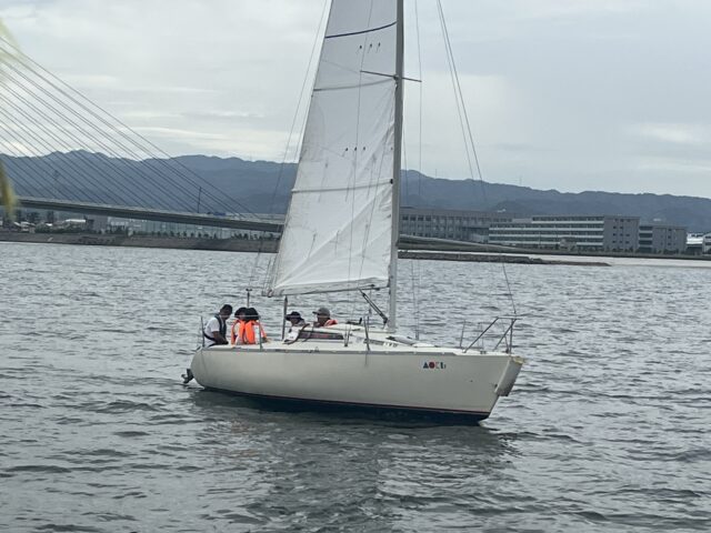 ・ A・B・Cの3グループが交代で3艇のヨットに4~5名乗船して約60分間のセーリングに出港。メインセールを揚げ順番でティラーを握り前方の目的物を目指して操船。海上の風は弱く波も穏やかで関西空港、関空連絡橋、淡路島、友が島などを眺めヨット独特の解放感にひたり、陸上待機時間は気象クイズやロープワークを学びました。最後まで親切丁寧に指導していただきました青木ヨット・インストラクターの皆さまありがとうございました、感謝いたします。(M.I)