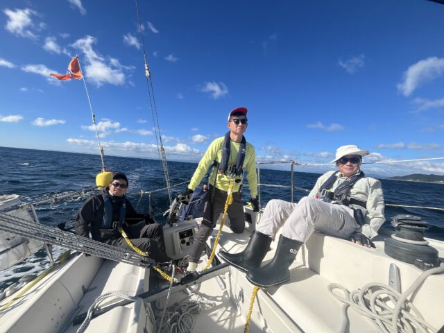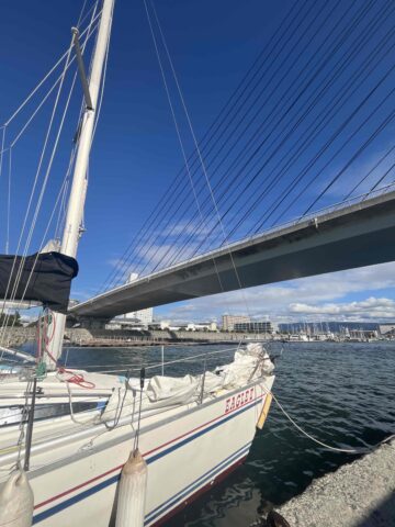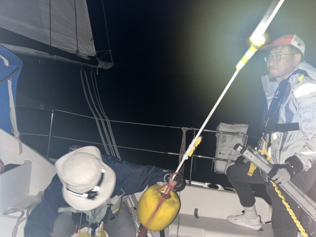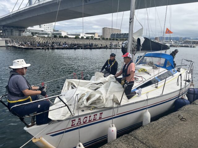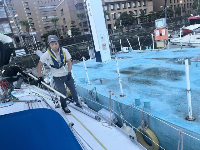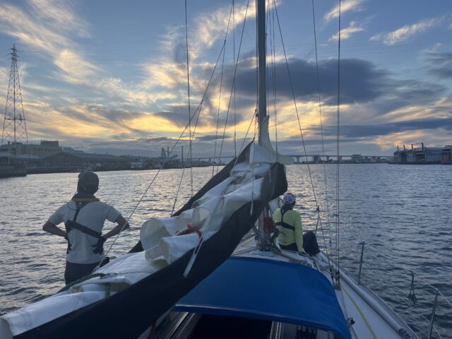 一日目は関空一周約15マイルを実施。微風2m/sの中で帆走や機帆走の練習を行い、次第に4名の参加者のチームワークが高まってきます。セイルアップやウインチの重たさに驚きながらも、無事に計画通りに帰港。