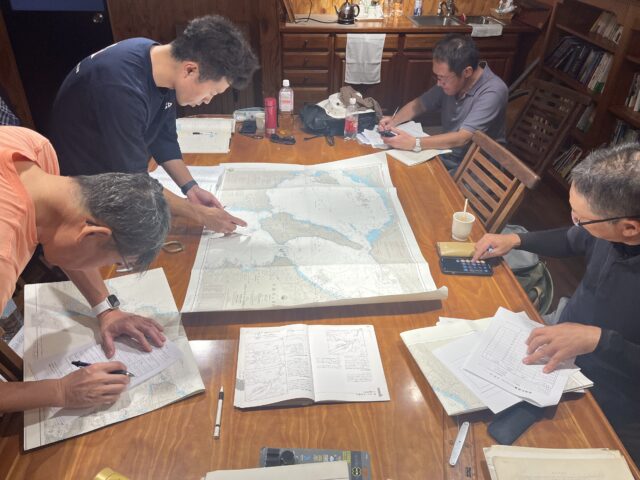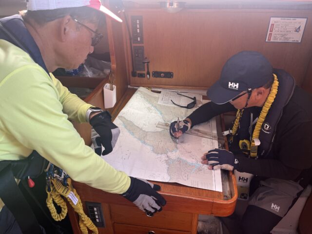 短いレグですが、出航前に受講生自ら海図に線を引いて頂き、航海計画を立案して頂きました。