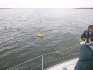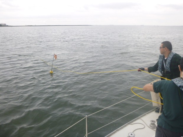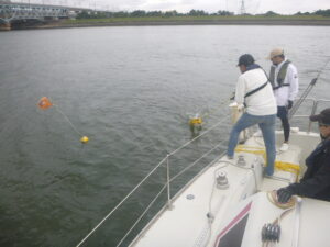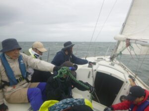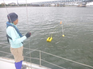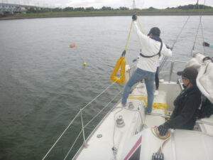 10月の練習テーマは、「落水者救助」です。アオキ・ヨットスクールの修得者であるクラブ員は、BKBコースで8の字救助法を習いました。現実の落水事故では、風浪の条件により要救助者に近付けないことがあります。そんな時には、レスキュースリングを水に浮くロープで曳きながら要救助者の周りを旋回する方法があります。これ、簡単そうに思えますが、コツが要るんですよ。とにかく試してみましょう! (あ)