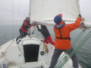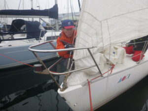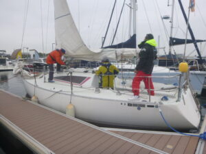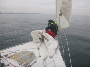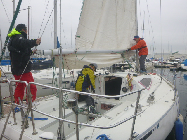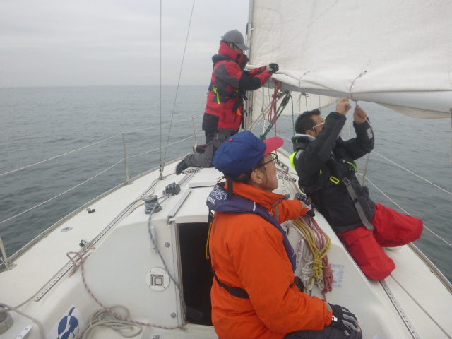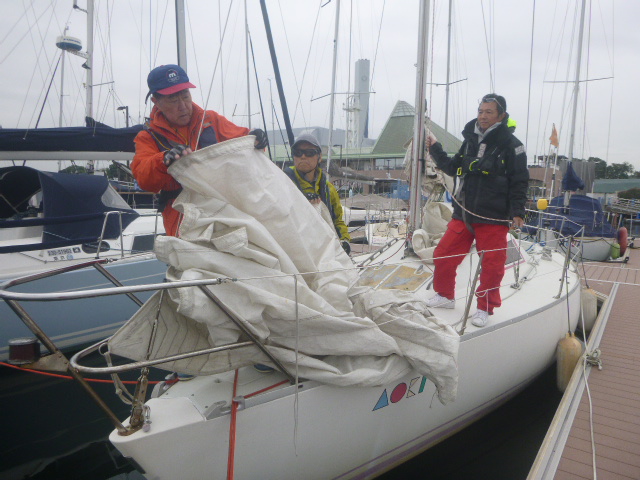 11月の練習テーマは、「リーフィング」です。タッキングや離着岸などが上手にできなくても、安全に留意していればヨットを楽しむことができます。ですが、リーフィング(縮帆)ができないと、艇とクルーが危険に晒されてしまうのです。ということで、今回のクラブ員はいつも以上に真剣でした。桟橋に係留した状態で練習した後は、海上で実践しました。生憎(?)、穏やかな天候でしたが、なかなか身体が動いてくれないものでした。 (あ)