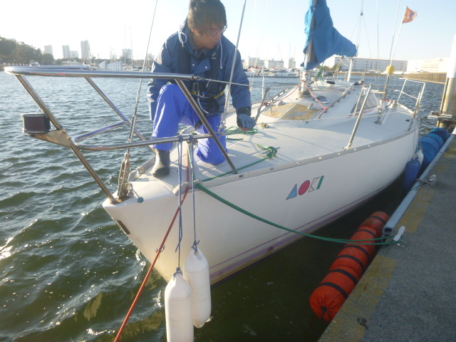 風が強くなると、アクアライン(東京湾横断道路)に速度規制がかかります。もっと強風だと通行止めになります。そんな天候でも、NhさんがSBD(Safe Boating & Docking)に挑戦しました。折しも、マリーナでは新年の安全祈願祭が執り行われていました。我々も、授業の合間に参加したので、もう安全です。(嬉) (あ)