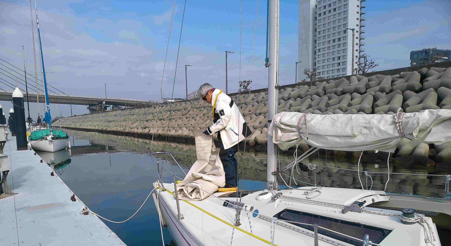 しかし、本日は風が無い。また、本日は1名で艇のオーナーでもあるので、シングルハンドのトレーニングを兼ねてのスペシャルメニューです。出航準備から帰港まで、すべて一人で行っていただきます。疑問点や、アドバイスが必要なところだけ手助けを行います。風がないので、風を見つけてヒーブツーのトレーニングを教科書に書かれている手順に則り練習を繰り返します。また、本日は、時間がたっぷりあるので、シングルハンドでのセーリングも併せて繰り返し行っていただきます。
