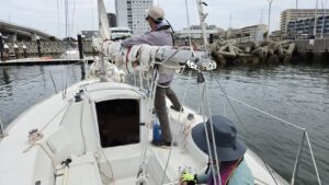 2日目は待望の海とセーリング。何度も何度も離着岸、風上前進離岸法を繰り返し、体で覚えます。