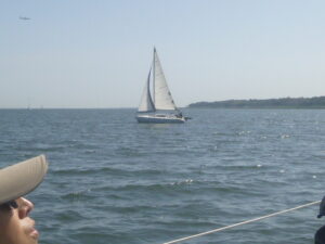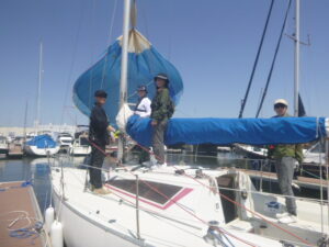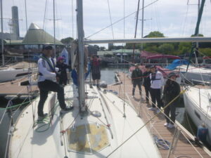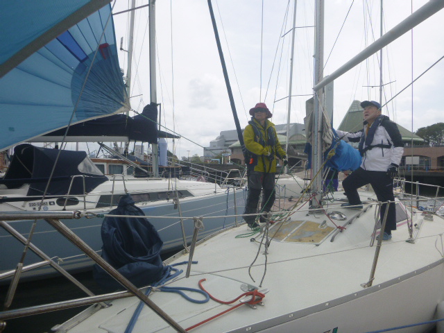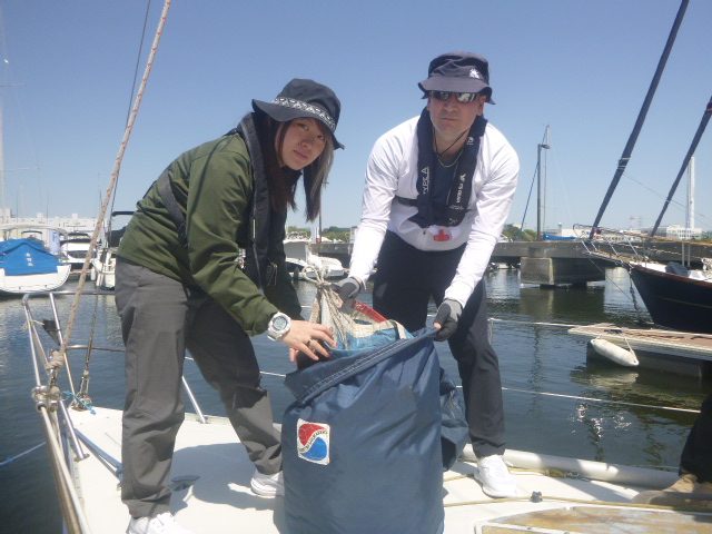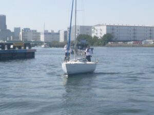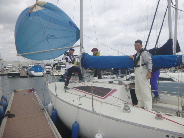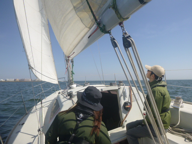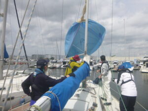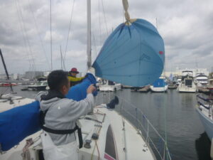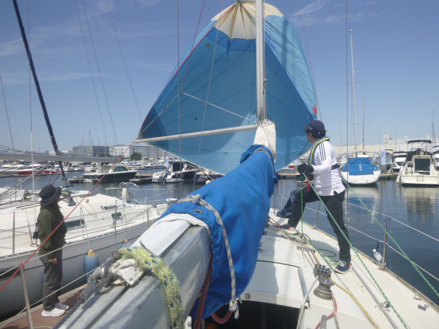4月の練習テーマは、「スピンネーカー」です。9日の平日コースには4名、12日には7名のメンバーが出席しました。イメージのなかにあるヨットは、三角形の帆が2枚ある姿だと思います。そして、実はもう1枚の帆「スピンネーカー」を使うと、追い風での帆走スピードを高めることができるのです。でも、操作するのには少々訓練が必要になります。先ずは、桟橋に係留した状態で、準備と操作を実践してみました。 (あ)