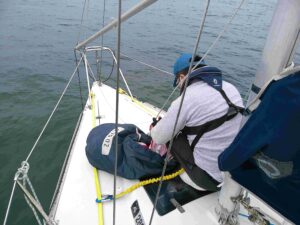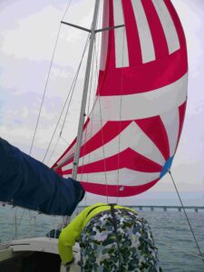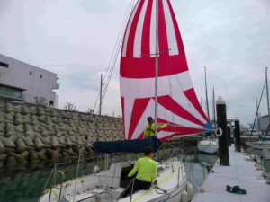 まずは、桟橋にてスピンネーカーの艤装を行い、アップ、ダウンの手順を練習します。その後海上に出て実際にスピンネーカーをアップ、ダウンします。桟橋での練習と違って、海上では揺れながらのれんしゅうとなります。体の安定を保ちながら慌てず一つ一つ手順を確認をしながらアップ、ダウンの練習をします。