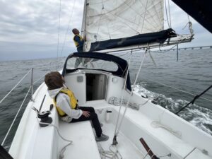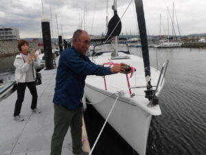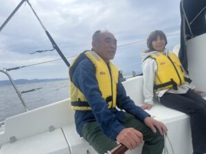 テストセーリングでは5m/sほどの風の中、セイルを揚げて頂き、舵を持って操船して頂きました。