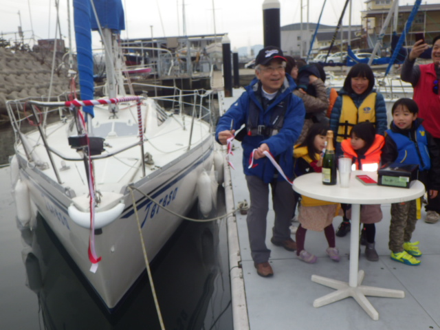 2017年3月5日の日曜日、午後3時くらいからTeresaの納艇式が行われました。 オーナーのご家族総出で、にぎやかな納艇式となりました。 安全航海とこれからの楽しいヨットライフを祈念して、恒例のテープカット、そしてシャンパンで乾杯です! その後、関空前の静穏水域で、テストセーリングし、無事修了となりました。 本当におめでとうございます。田尻マリーナの皆さん、新しい仲間をよろしくお願いします。