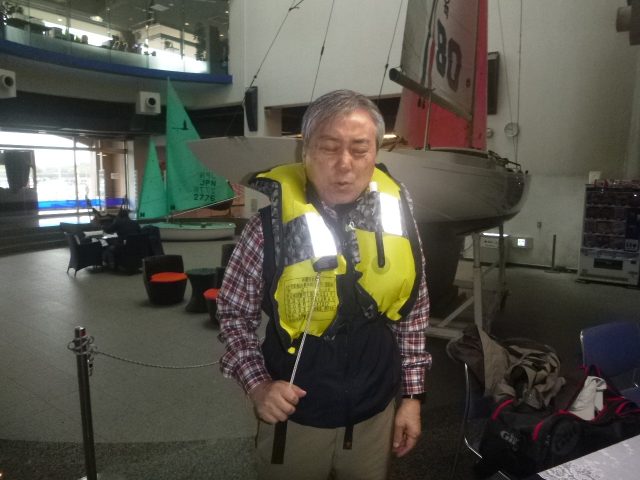ライフジャケットを膨らませたり、落水者ブイを救助したりと基本の安全を学びます。