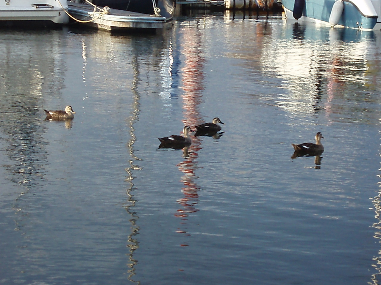 夕暮れの夢の島マリーナは、水鳥たちが和ませてくれます。 (あ)