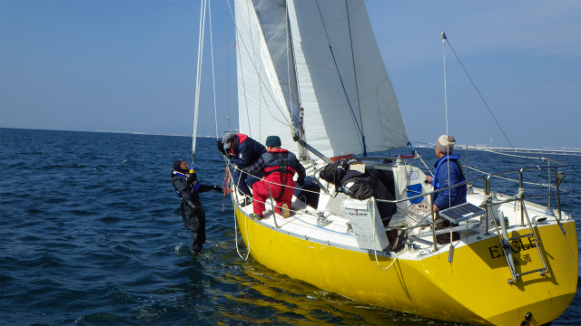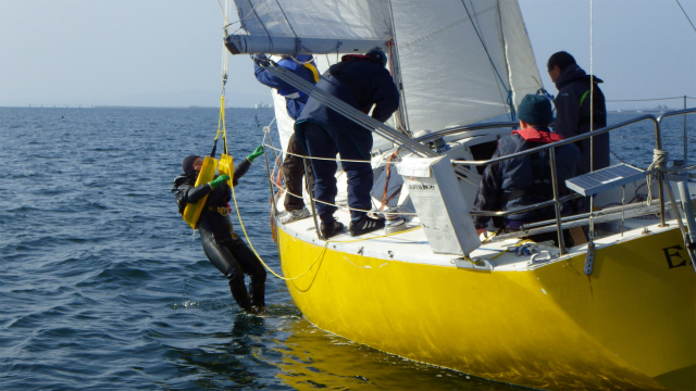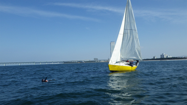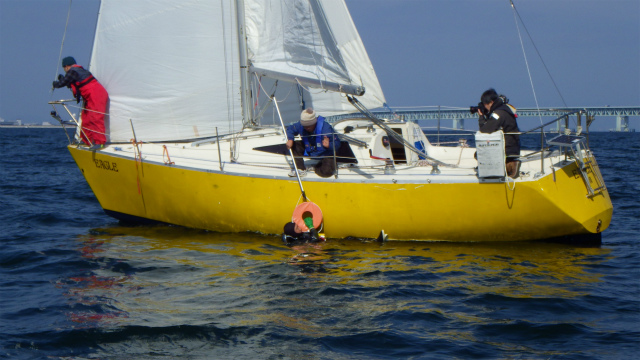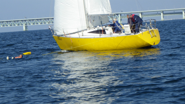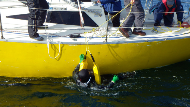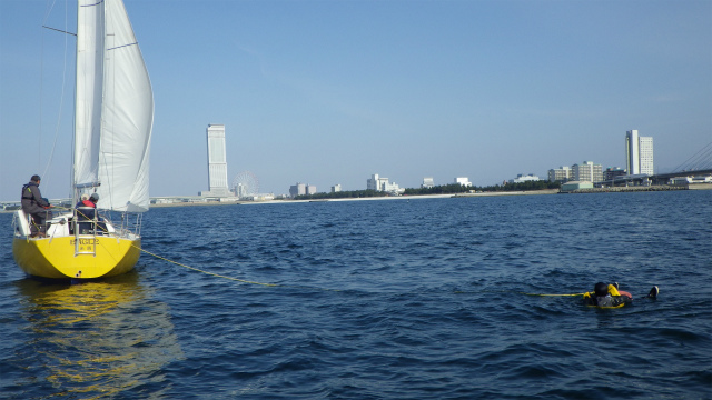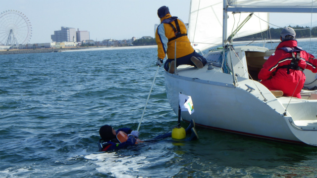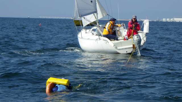 落水者救助デモンストレーションでは、実際に人間が落水し、3種類の救助法で、実地訓練を行いました。近日中に、動画もアップします。どうぞお楽しみに!