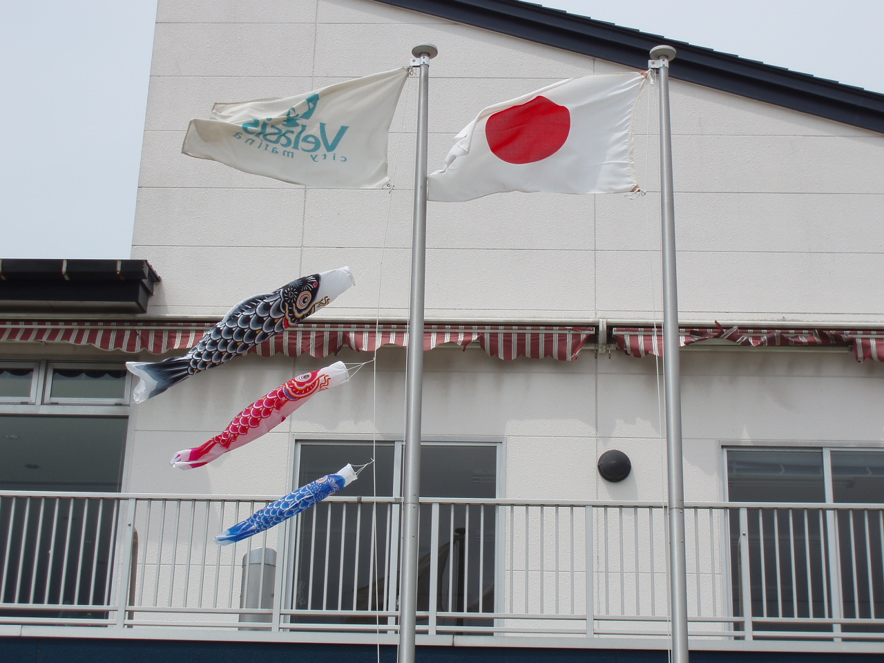 横須賀校のマリーナヴェラシスで、鯉のぼりが元気に泳いでいました。 いつまでも(震災で)ウジウジしていられませんからねっ! (あ)