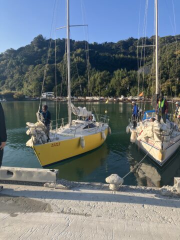 11時頃に紀淡海峡を通過、和歌山に入るといい風が吹いています。やっとセーリングです。後ろからの風を受けジャイブの繰り返し、後方からイーグル2がスピンを揚げて追っかけてきます。最短コースを目指しながらのジャイビング。宮崎の鼻を回ってからはアビーム。湯浅広港でセールをダウンしアンカリングの準備を行います。手順をおさらいしていざ入港、アンカリング。手順のおさらいをしている間にイーグル2に抜かれ、アンカリングのポイント位置の確認を行う。ただ、岸からの指示は漁船が通過するので、なるべく岸壁寄りにとの指示が飛ぶ。指示を受けアンカー打つも案の定、効かない。再度、アンカーの打ち直しを行い無事に槍付け完了。